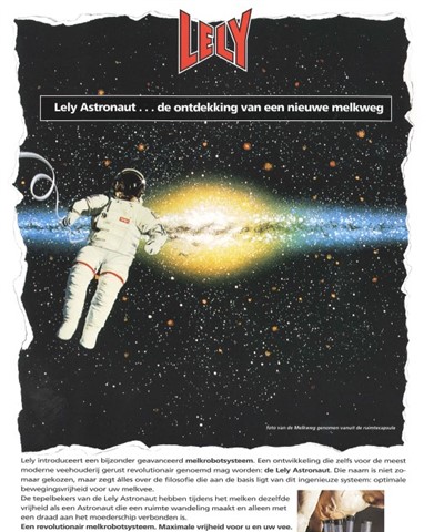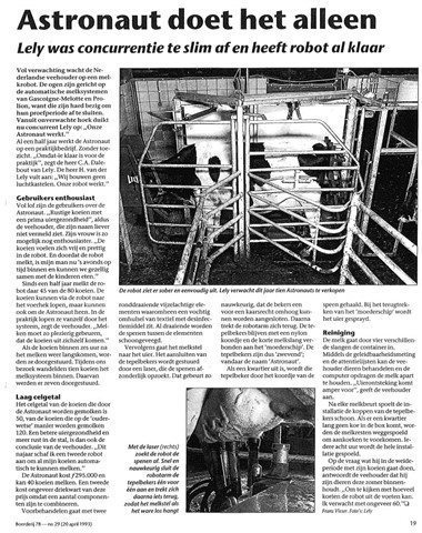 This summer 33 years ago (1992), the Astronaut prototype milked its first cow. But actially Lely's milking journey started in 1985. Several wild thoughts how to milk automatically were written down in patents. An example of such from 1985 is added: locating the udder via a build-in metal plate. All wild thougts ended in 1992 with more or less the present design by finding the teats via a laser. Lely kept the long development of the milking robot secret till 1993. The first article with the announcement of the Astronaut came in like a bomb. Nobody thougt that a company which always has made field machinery could develop such an earth moving device. This very first article is attached, however in Dutch.